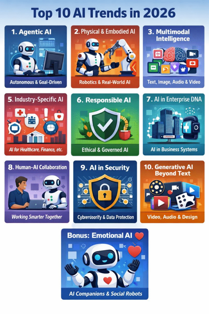 Here are the Top 10 AI Trends expected to shape 2026, based on expert forecasts, industry reports, and emerging innovations: