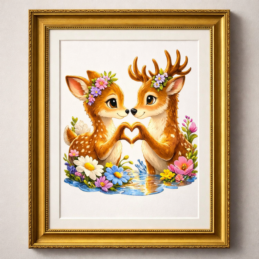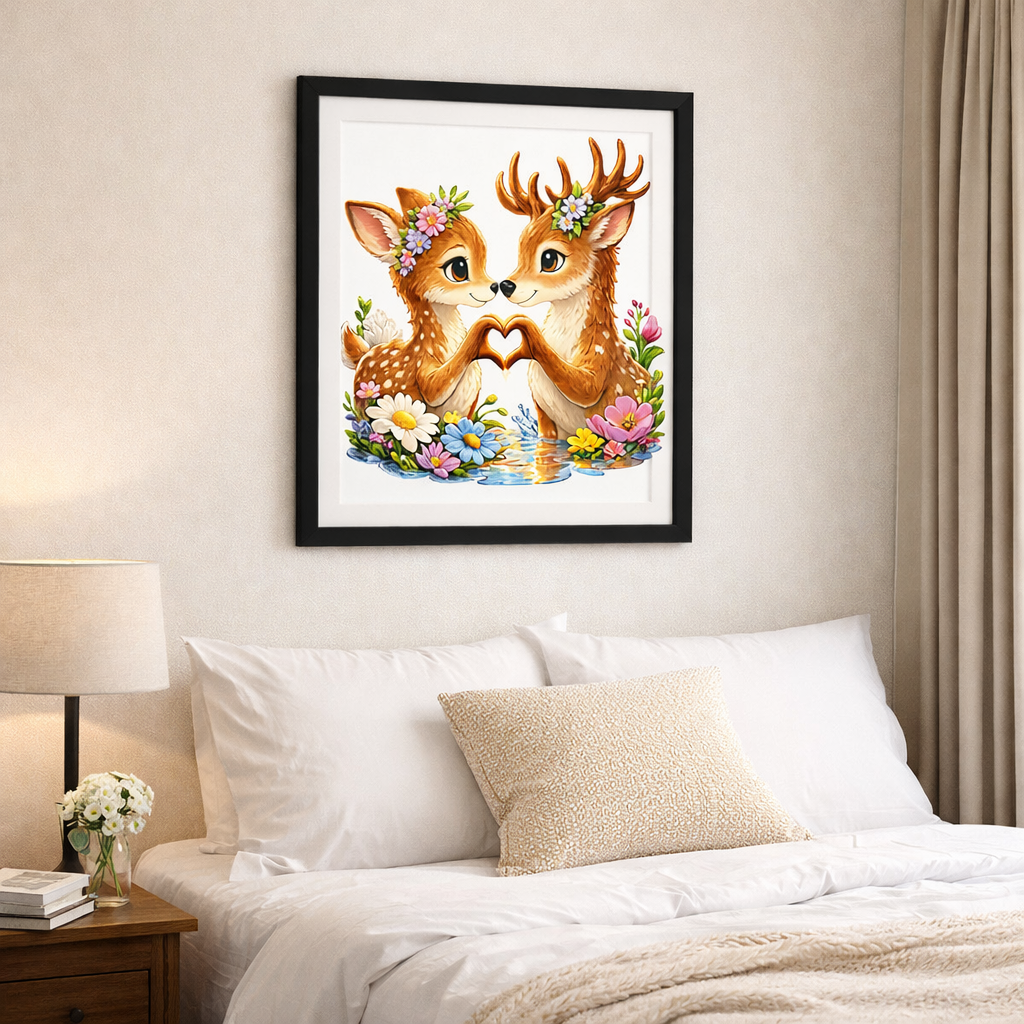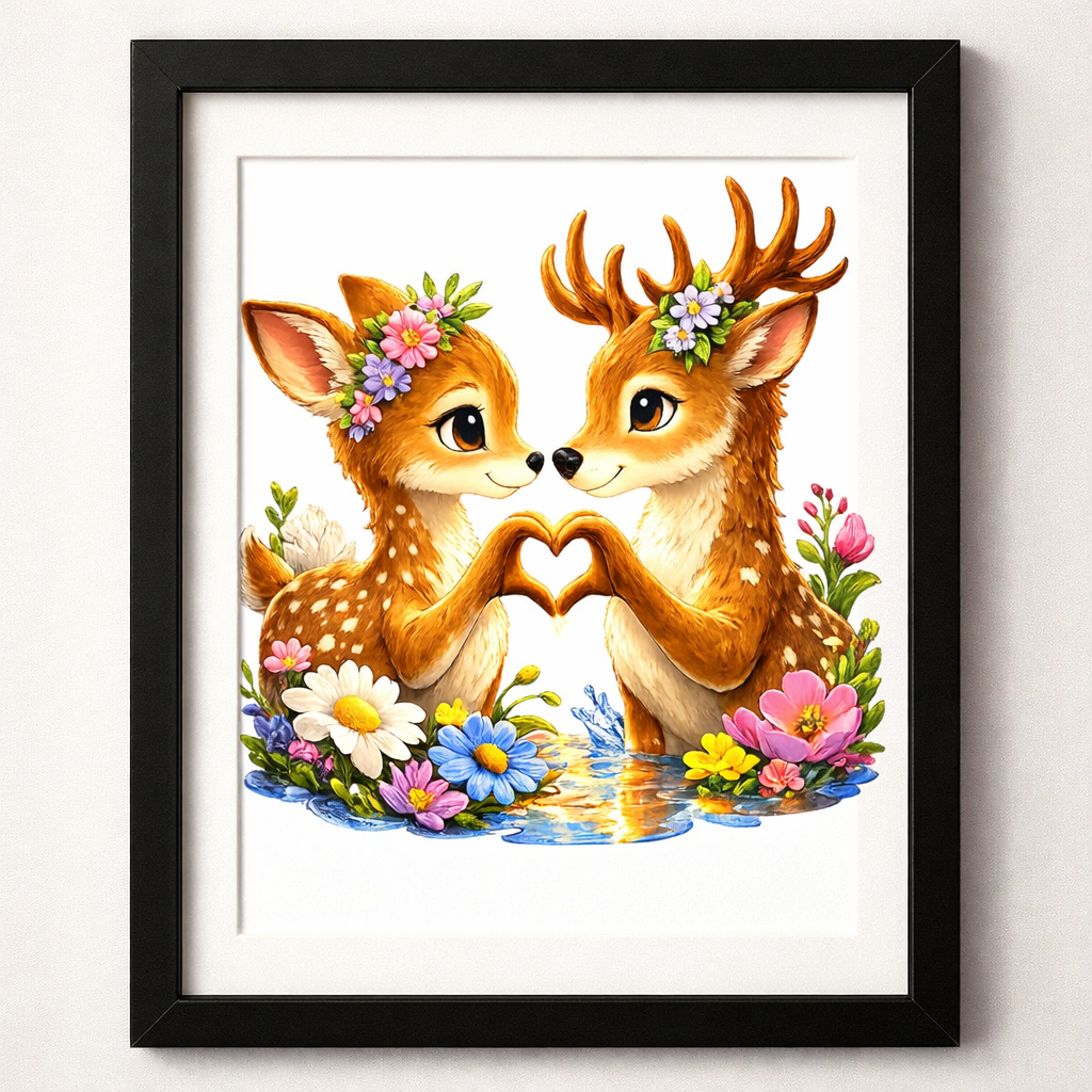 Add warmth and charm to your home with this beautiful woodland deer couple artwork. This adorable illustration features two deer forming a heart shape with their hooves, surrounded by colorful flowers and soft nature elements.